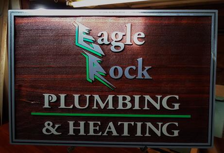 Cedar Business sign for Eagle Rock Plumbing and Heating Vernon BC.This a sandblasted old growth vertical sawed cedar sign.Made by Condor Signs Vernon BC